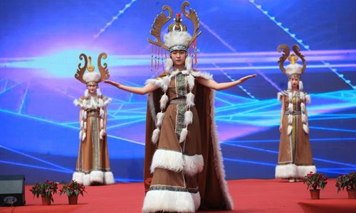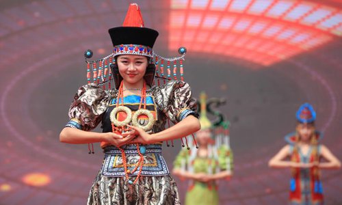 Actresses present costumes of Mongolian ethnic group during a folk culture tourism festival in Yuquan District of Hohhot, north China's Inner Mongolia Autonomous Region, July 6, 2018. (Xinhua/Wei Yuefei)