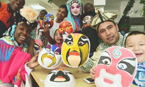 Foreign students and children show Peking Opera masks they painted in Zhenjiang city, Jiangsu Province, on July 9, 2018. (Photo/Asianewsphoto)