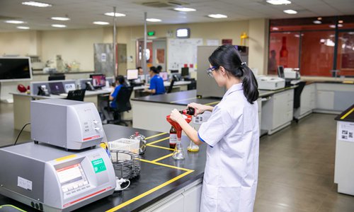 A Budweiser quality assurance lab professional conducts sample tests on the fully-automatic beer analyzer. The AB InBev Foshan brewery was designed and built with a fully-functioning lab, which is equipped with a wide range of industry-leading equipment. The lab tests more than 6,500 criteria per day to improve the quality assurance standards across all stages of brewing: raw material quality, production process and packaging.Photo: Courtesy of AB InBev