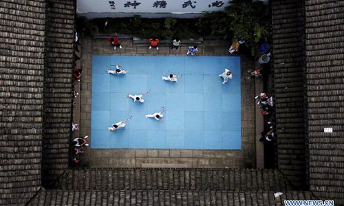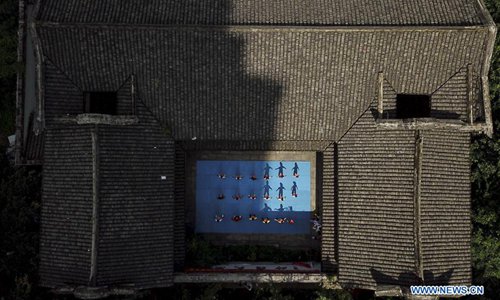 Aerial photo taken on July 14, 2018 shows children practising martial arts at Wenzhou Wushu Museum in Wenzhou, east China's Zhejiang Province. More than 120 children visited the museum on Sunday to learn about martial arts. (Xinhua/Su Qiaojiang)