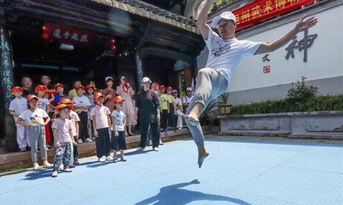 A martial arts instructor demonstrates actions for children at Wenzhou Wushu Museum in Wenzhou, east China's Zhejiang Province, July 14, 2018. More than 120 children visited the museum on Sunday to learn about martial arts. (Xinhua/Su Qiaojiang)