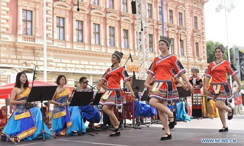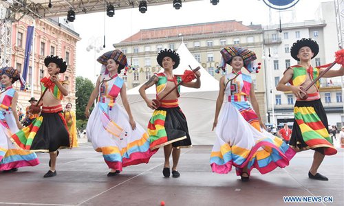Chinese artists perform at Ban Josip Jelacic square during the 52nd International Folklore Festival in Zagreb, capital of Croatia, on July 22, 2018. (Xinhua/Davor Visnjic)