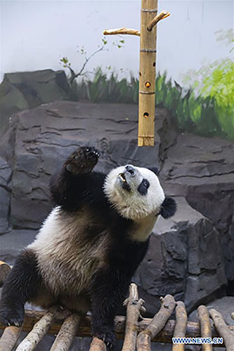 A giant panda twin enjoys itself in an air-conditioned room at the Nanjing Hongshan Forest Zoo in Nanjing, capital of east China's Jiangsu Province, Aug. 10, 2018. Staff workers at the zoo celebrated the 3rd birthday anniversary for the female giant panda twins "Hehe" and "Jiujiu" on Friday. (Xinhua/Su Yang)