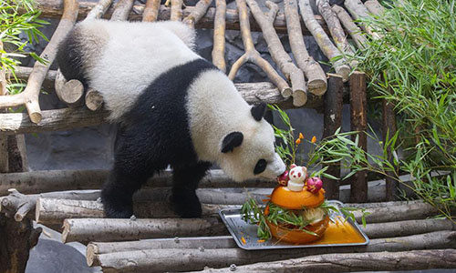 A giant panda twin eats birthday cake in an air-conditioned room at the Nanjing Hongshan Forest Zoo in Nanjing, capital of east China's Jiangsu Province, Aug. 10, 2018. Staff workers at the zoo celebrated the 3rd birthday anniversary for the female giant panda twins "Hehe" and "Jiujiu" on Friday. (Xinhua/Su Yang)