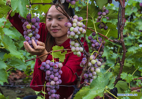 A visitor picks grapes in Bingjiao Village, Yongqing County of north China's Hebei Province, Aug. 14, 2018. Bingjiao, a well-known village for grape planting in Yongqing County, has introduced new species and technologies for the growing of grapes in recent years. There are now over 5,000 Mu (about 333 hectares) of grape fields in the village which can yield a total value of 30 million yuan (about 4.37 million USdollars) every year. (Xinhua/Li Xiaoguo)