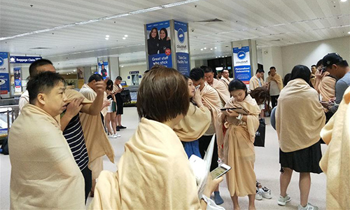 Photo taken on Aug. 17, 2018 shows passengers waiting at the Manila international airport after the plane crash-landed, in Manila, the Philippines. A Boeing 737-800 passenger plane of China's Xiamen Airlines landed on its belly early Friday at the Manila international airport, an airport official said. (Xinhua)
