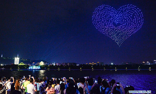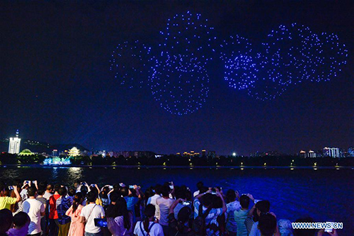 People view drones performance at the Orange Isle scenic area in Changsha, central China's Hunan Province, Aug. 16, 2018. Groups of drones performed a light show here to greet the Qixi festival, or Chinese Valentine's Day, which falls on Aug. 17 this year. (Xinhua/Zhang Xiaoyu)