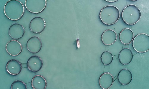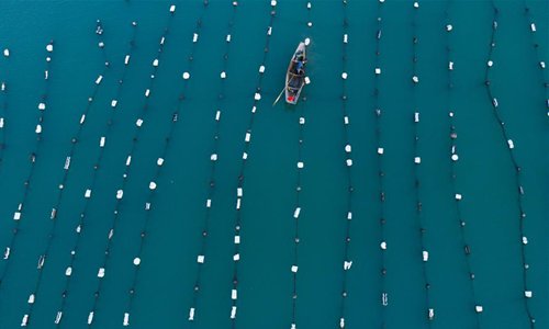 A fishing boat is seen in a large yellow croaker cultivation zone in the sea area of Nanji island in Wenzhou, east China's Zhejiang Province, Aug. 18, 2018. Local fishermen were busy with catching of mussel and large yellow croaker in August. Nanji Township developed mariculture and island tourism industries in recent years. It also built a market network and expanded the market of characteristic marine products. (Xinhua/Xu Yu)