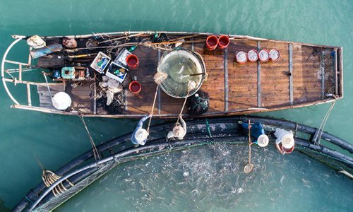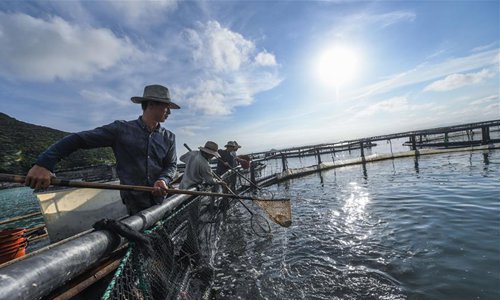 Fishermen catch fish at a mariculture zone in the sea area of Nanji island in Wenzhou, east China's Zhejiang Province, Aug. 18, 2018. Local fishermen were busy with catching of mussel and large yellow croaker in August. Nanji Township developed mariculture and island tourism industries in recent years. It also built a market network and expanded the market of characteristic marine products. (Xinhua/Xu Yu)