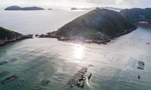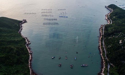 Aerial photo taken on Aug. 18, 2018 shows a mariculture zone in the sea area of Nanji island in Wenzhou, east China's Zhejiang Province. Local fishermen were busy with catching of mussel and large yellow croaker in August. Nanji Township developed mariculture and island tourism industries in recent years. It also built a market network and expanded the market of characteristic marine products. (Xinhua/Xu Yu)