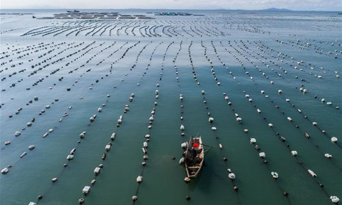 A fishing boat is seen in a mussel cultivation zone in the sea area of Nanji island in Wenzhou, east China's Zhejiang Province, Aug. 18, 2018. Local fishermen were busy with catching of mussel and large yellow croaker in August. Nanji Township developed mariculture and island tourism industries in recent years. It also built a market network and expanded the market of characteristic marine products. (Xinhua/Xu Yu)