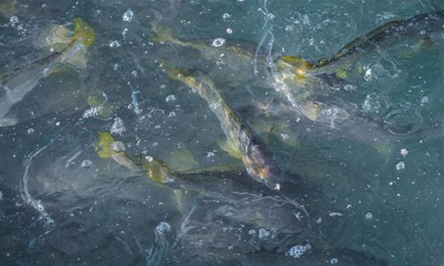 Photo taken on Aug. 18, 2018 shows large yellow croaker in a mariculture zone in the sea area of Nanji island in Wenzhou, east China's Zhejiang Province. Local fishermen were busy with catching of mussel and large yellow croaker in August. Nanji Township developed mariculture and island tourism industries in recent years. It also built a market network and expanded the market of characteristic marine products. (Xinhua/Xu Yu)