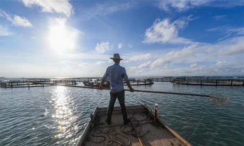 A fisherman prepares to catch fish at a mariculture zone in the sea area of Nanji island in Wenzhou, east China's Zhejiang Province, Aug. 18, 2018. Local fishermen were busy with catching of mussel and large yellow croaker in August. Nanji Township developed mariculture and island tourism industries in recent years. It also built a market network and expanded the market of characteristic marine products. (Xinhua/Xu Yu)