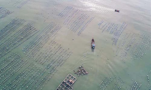Aerial photo taken on Aug. 19, 2018 shows a mariculture zone in the sea area of Nanji island in Wenzhou, east China's Zhejiang Province. Local fishermen were busy with catching of mussel and large yellow croaker in August. Nanji Township developed mariculture and island tourism industries in recent years. It also built a market network and expanded the market of characteristic marine products. (Xinhua/Xu Yu)