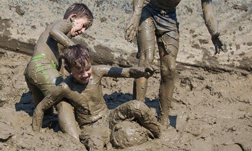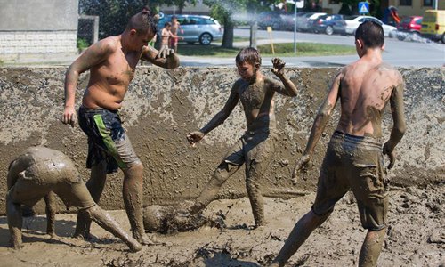 Children take part in a small football tournament in a fenced playground full of mud in Gradiste, Croatia, on Aug. 19, 2018. (Xinhua/Davor Javorovic)