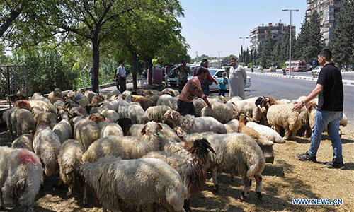 People buy sacrificial sheep at a livestock market during the Eid al-Adha in Damascus, capital of Syria, on Aug. 22, 2018. (Xinhua/Ammar Safarjalani)