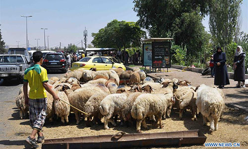 Sacrificial sheep are seen at a livestock market during the Eid al-Adha in Damascus, capital of Syria, on Aug. 22, 2018. (Xinhua/Ammar Safarjalani)