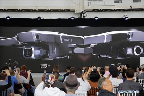Photo taken on Aug. 23, 2018 shows the launching ceremony of Mavic 2 Pro and Mavic 2 Zoom of DJI in New York, the United States. Chinese drone manufacturer DJI released its new Mavic drone lineup, the Mavic 2 Pro and Mavic 2 Zoom, in New York on Thursday. Mavic 2 Pro has an integrated Hasselblad camera, and Mavic 2 Zoom is a foldable consumer drone with optical zoom capability. (Xinhua/Li Muzi)