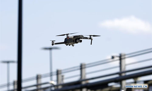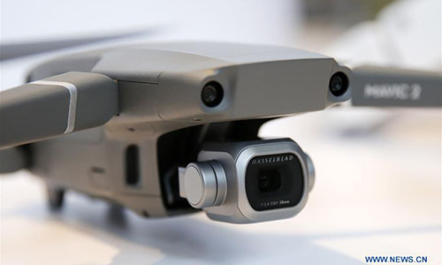 Photo taken on Aug. 23, 2018 shows the newly-released DJI Mavic 2 Pro drone during the launching ceremony in New York, the United States. Chinese drone manufacturer DJI released its new Mavic drone lineup, the Mavic 2 Pro and Mavic 2 Zoom, in New York on Thursday. Mavic 2 Pro has an integrated Hasselblad camera, and Mavic 2 Zoom is a foldable consumer drone with optical zoom capability. (Xinhua/Li Muzi)