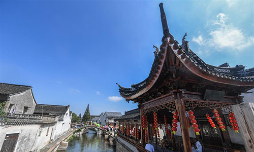 Photo taken on Aug. 23, 2018 shows the view of Yigao Village decorated with lanterns and festoons in Huzhou City, east China's Zhejiang Province. A folk customs and culture festival was held here on Thursday. Traditional forms of art like lion dance, paper cutting, embroidery, etc. were on display during the festival. (Xinhua/Xu Yu)