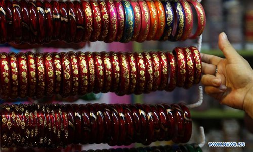 An exhibitor shows the products at a stall of the Teej Fair organized for the upcoming Teej festival in Kathmandu, Nepal, Aug. 25, 2018. During the festival, married women fast and pray for good health and longevity of their husbands and unmarried women pray for marrying healthy and handsome husbands. (Xinhua/Sunil Sharma)