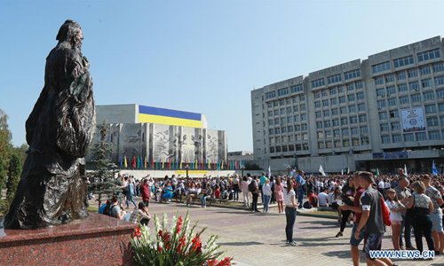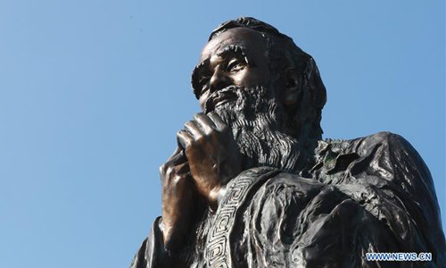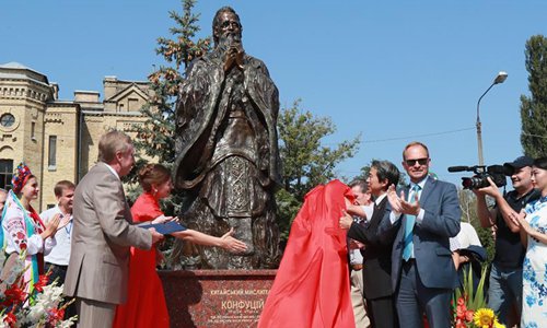 A statue of ancient Chinese educator and philosopher Confucius is seen in front of the National Technical University of Ukraine in Kiev Aug. 31, 2018. The statue was unveiled on Friday. (Xinhua/Chen Junfeng)