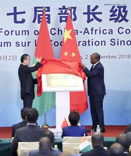 Chinese State Councilor and Foreign Minister Wang Yi and foreign ministers from African countries, who are here for the Seventh Ministerial Conference of the Forum on China-Africa Cooperation (FOCAC), attend an inauguration ceremony of Burkina Faso Embassy in Beijing, capital of China, Sept. 2, 2018. (Xinhua/Ding Haitao)