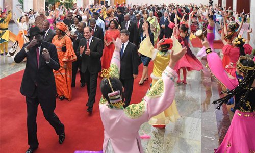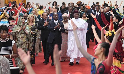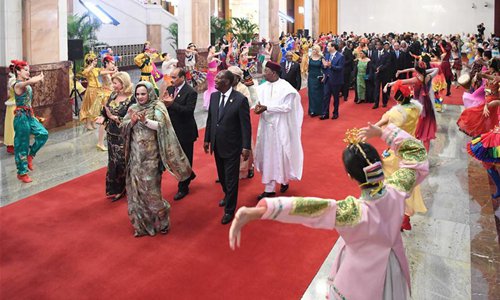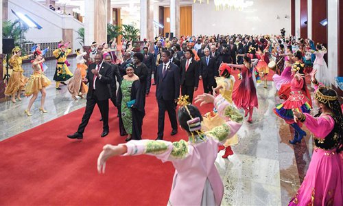 Artists stage a performance after a banquet held to welcome guests attending the Beijing Summit of the Forum on China-Africa Cooperation (FOCAC) at the Great Hall of the People in Beijing, capital of China, Sept. 3, 2018. (Xinhua/Yan Yan)