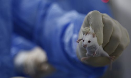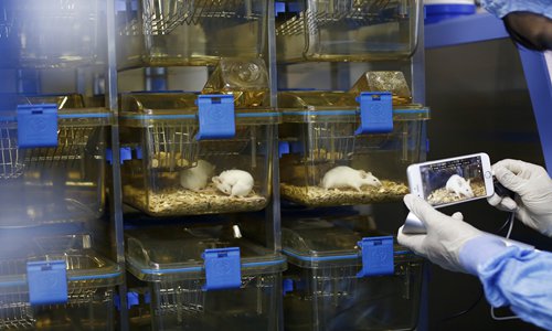 A staff member from the Laboratory Animal Center of the Sixth Affiliated Hospital of Sun Yat-sen University grasps a rat on Monday in Guangzhou, South China's Guangdong Province. Photo: VCG