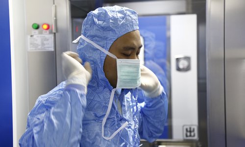 A research fellow wears an isolation gown, gloves, and mask before going into the center. Photo: VCG