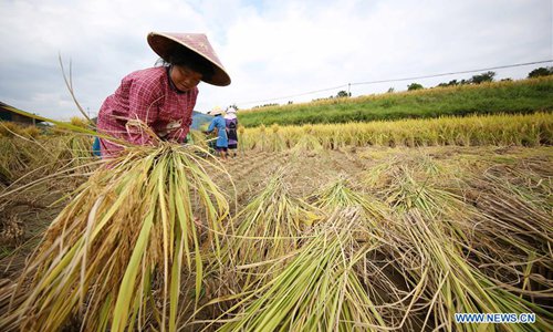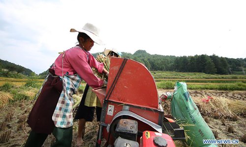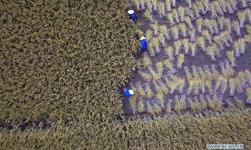 Villagers harvest paddy rice in fields in Yangjia Village, Danzhai County of southwest China's Guizhou Province, Sept. 10, 2018. (Xinhua/Huang Xiaohai)