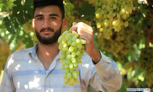 A Palestinian farmer shows a bunch of grapes in a field in the West Bank city of Hebron on Sept. 12, 2018. Hebron is famous for its quality grape production. (Xinhua/Mamoun Wazwaz)
