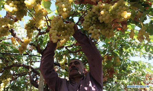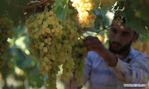 A Palestinian farmer picks grapes in a field in the West Bank city of Hebron on Sept. 12, 2018. Hebron is famous for its quality grape production. (Xinhua/Mamoun Wazwaz)