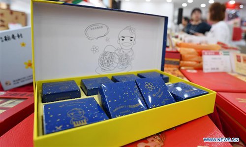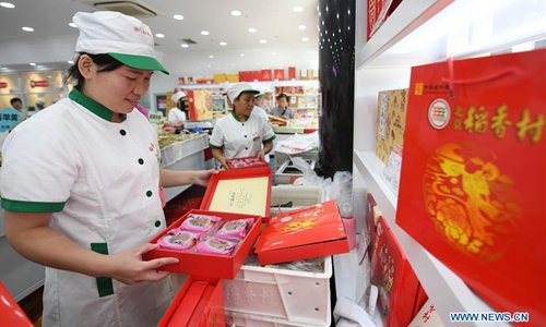 Staff members package mooncakes for customers at a shop in Beijing, capital of China, Sept. 21, 2018. Mooncake is a traditional pastry for the Mid-Autumn Festival, which falls on the 15th day of the eighth month of the Chinese lunar calendar, or Sept. 24 this year. (Xinhua/Zhang Chenlin)