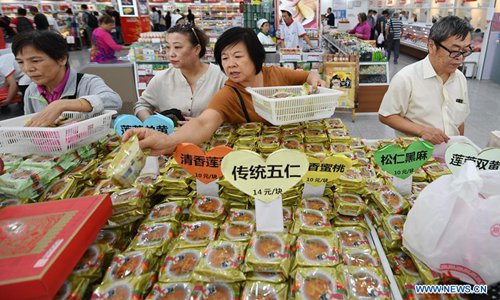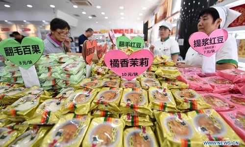 Citizens buy mooncakes at a shop in Beijing, capital of China, Sept. 21, 2018. Mooncake is a traditional pastry for the Mid-Autumn Festival, which falls on the 15th day of the eighth month of the Chinese lunar calendar, or Sept. 24 this year. (Xinhua/Zhang Chenlin)