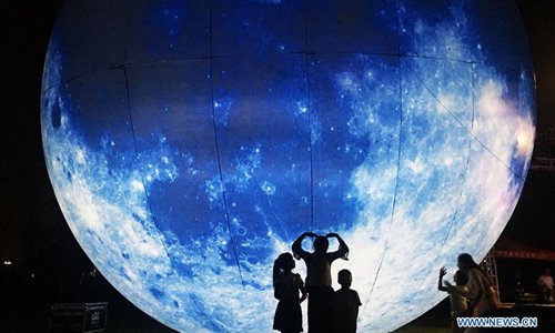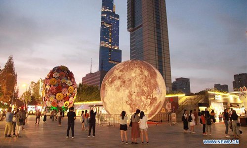 Pedestrians look at a moon installation set up to mark the upcoming Mid-Autumn Festival at a plaza in Nanjing, east China's Jiangsu Province, Sept. 23, 2018. (Xinhua/Liu Jianhua)