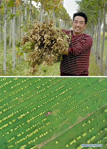 In the combined photo taken on Sept. 18, 2018, farmer Wang Lukun shows the harvested peanuts in Guolongzhuang Village of the Xingtai Economic Development Zone in north China's Hebei Province. (top). In the aerial photo taken on the same day (bottom), farmer Wang Lukun is seen in a peanut field. China marks its first Farmers' Harvest Festival on Sept. 23 this year. From 2018 on, the festival, to be celebrated on the Autumnal Equinox each year, is set to be observed annually to greet the harvest season and honour the agricultural workers. (Xinhua/Mu Yu)