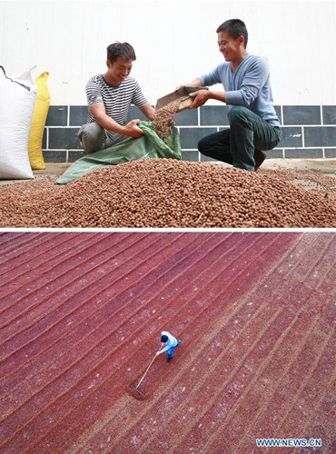 In the combined photo taken on Sept. 18, 2018, villager Wang Shengtang (R) puts the harvested wild jujube into a bag in Liulin Township of Neiqiu County, north China's Hebei Province. (top). In the aerial photo taken on the same day (bottom), villager Wang Shengtang rakes wild jujube for air-drying. China marks its first Farmers' Harvest Festival on Sept. 23 this year. From 2018 on, the festival, to be celebrated on the Autumnal Equinox each year, is set to be observed annually to greet the harvest season and honour the agricultural workers. (Xinhua/Mu Yu)
