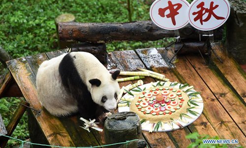 Giant panda Xinxing tastes a specially-made mooncake at Chongqing Zoo in southwest China's Chongqing, Sept. 24, 2018. The 36-year-old giant panda Xinxing is one of the oldest giant pandas in the world. This year's Mid-Autumn Festival falls on Sept. 24, the 15th day of the eighth month on China's lunar calendar. (Xinhua/Tang Yi)