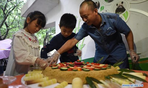 Children and a staff member of Chongqing Zoo prepare a specially-made mooncake for giant panda Xinxing in southwest China's Chongqing, Sept. 24, 2018. The 36-year-old giant panda Xinxing is one of the oldest giant pandas in the world. This year's Mid-Autumn Festival falls on Sept. 24, the 15th day of the eighth month on China's lunar calendar. (Xinhua/Tang Yi)