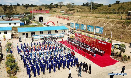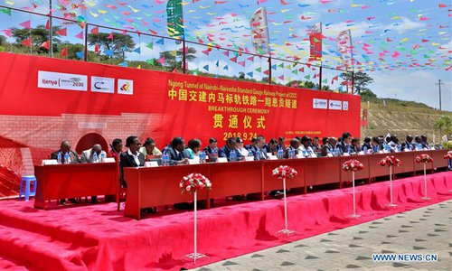 Photo taken on Sept. 24, 2018 shows a breakthrough ceremony of Ngong tunnel of the Standard Gauge Railway (SGR) in Nairobi, capital of Kenya. China Communications Construction Company (CCCC) has drilled the longest railway tunnel in East Africa, the company said Monday. The tunnel is part of phase 2A of the Standard Gauge Railway that runs from Nairobi to Naivasha town. (Xinhua/Wang Teng)