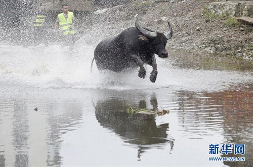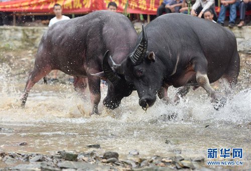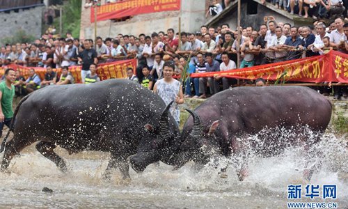 A traditional bullfight was held in Dudong township, Sanjiang Dong Autonomous County in South China's Guangxi Zhuang Autonomous Region on September 25. A total of 14 bulls took part in the event held to celebrate the harvest. Photos: Xinhua