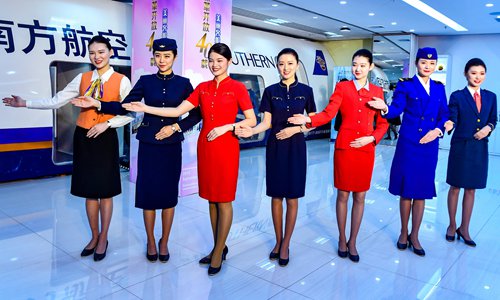Flight attendants from China Southern Airlines showcase uniforms worn since the 1970s on Wednesday at a public display in Guangzhou, capital of South China's Guangdong Province. Uniforms evolved over the past four decades with China's reform and opening-up. China Southern Airlines said in September that it plans to more than double the size of its fleet to 2,000 aircrafts by 2035 and is exploring ways to cooperate with low-cost carriers. Photo: VCG
