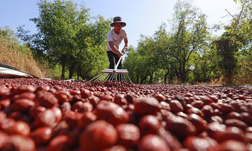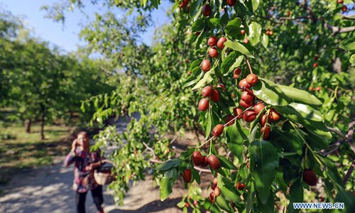 Jujubes are pictured at a plantation in Yutian County of Tangshan, north China's Hebei Province, Oct. 2, 2018. Farmers in Yutian are busy picking and airing jujubes during the harvest season in October. (Xinhua/Liu Mancang)
