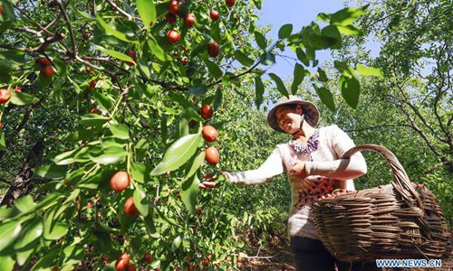 A farmer picks jujubes in Yutian County of Tangshan, north China's Hebei Province, Oct. 2, 2018. Farmers in Yutian are busy picking and airing jujubes during the harvest season in October. (Xinhua/Liu Mancang)