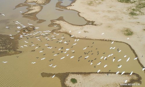 Egrets are seen flying above the Maying water area of the Poyang Lake in Duchang County, east China's Jiangxi Province, Oct. 4, 2018. (Xinhua/Fu Jianbin)