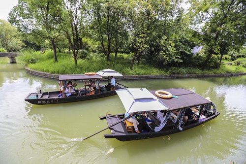 Tourists row on a lake in the Xixi National Wetland Park. Photo: VCG