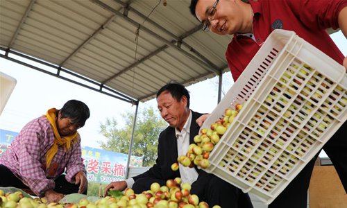 Staff members sort out winter jujubes at an e-business sales center at Xiawa Town in Zhanhua District of Binzhou, east China's Shandong Province, Oct. 8, 2018. (Xinhua/Jia Haining)
