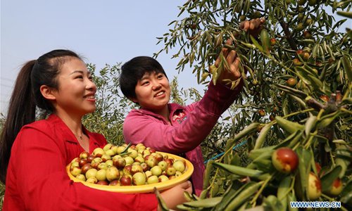 Tourists pick winter jujubes at a jujube plantation in Zhanhua District of Binzhou, east China's Shandong Province, Oct. 8, 2018. (Xinhua/Jia Haining)