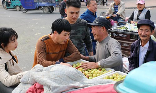 Farmers sell winter jujubes at a jujube trade center at Xiawa Town in Zhanhua District of Binzhou, east China's Shandong Province, Oct. 8, 2018. (Xinhua/Jia Haining)